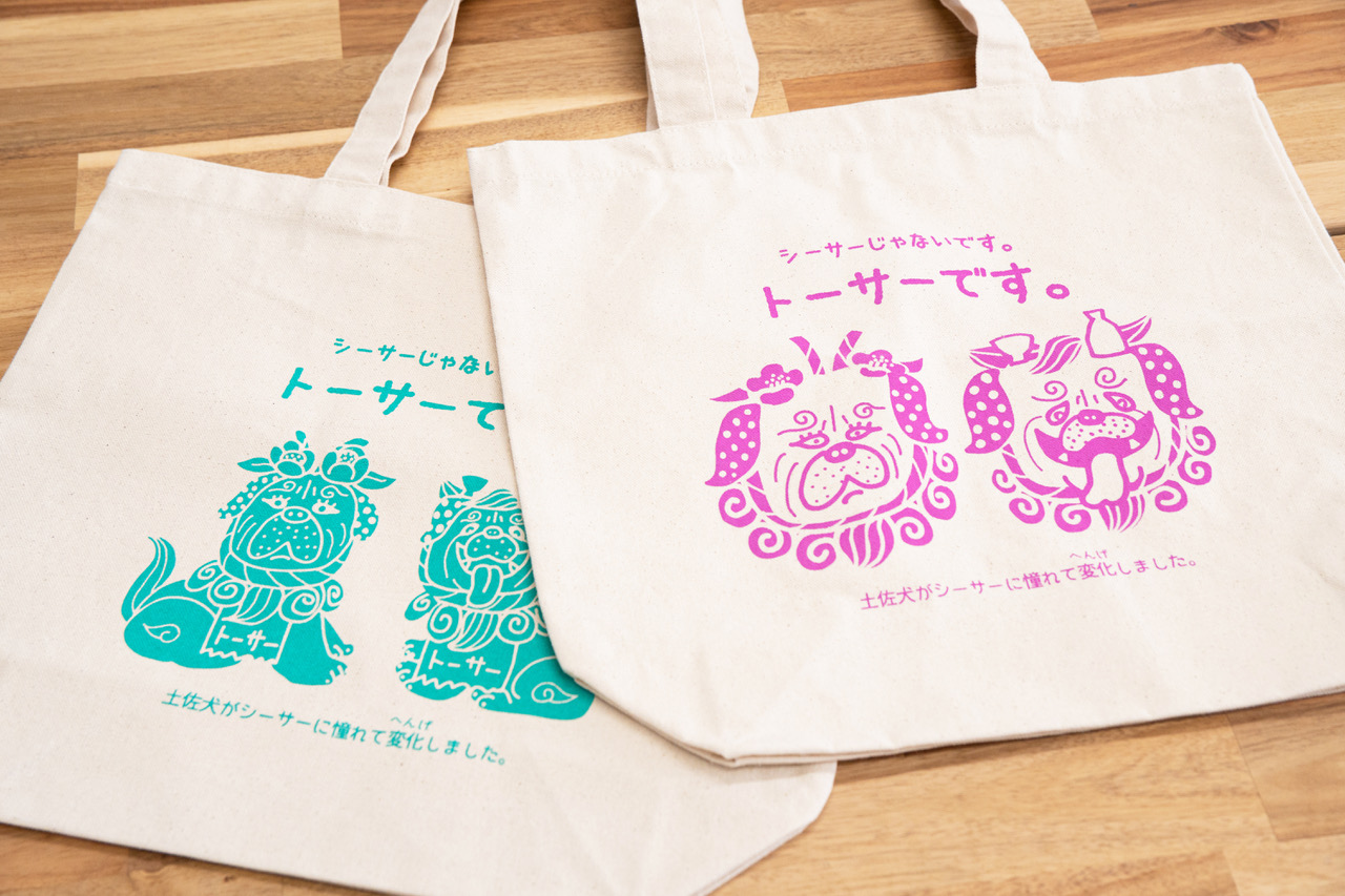 シーサーに憧れた土佐犬が変化(へんげ)した、その名も「トーサー」。高知土産の新定番としてコロナ禍にオリジナル商品となる「置き物」が登場しましたが、トートバッグやペアキーホルダー、扇子など続々と新商品が登場しています!お買い求めは、高知県内のお土産物店へ!